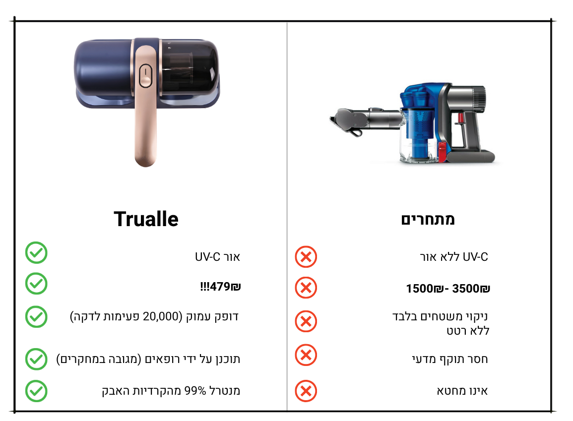Trualle™ לא רק מנקה את המיטה, הוא מחזיר לכם ולילדים שקט, אוויר נקי ושינה רגועה.